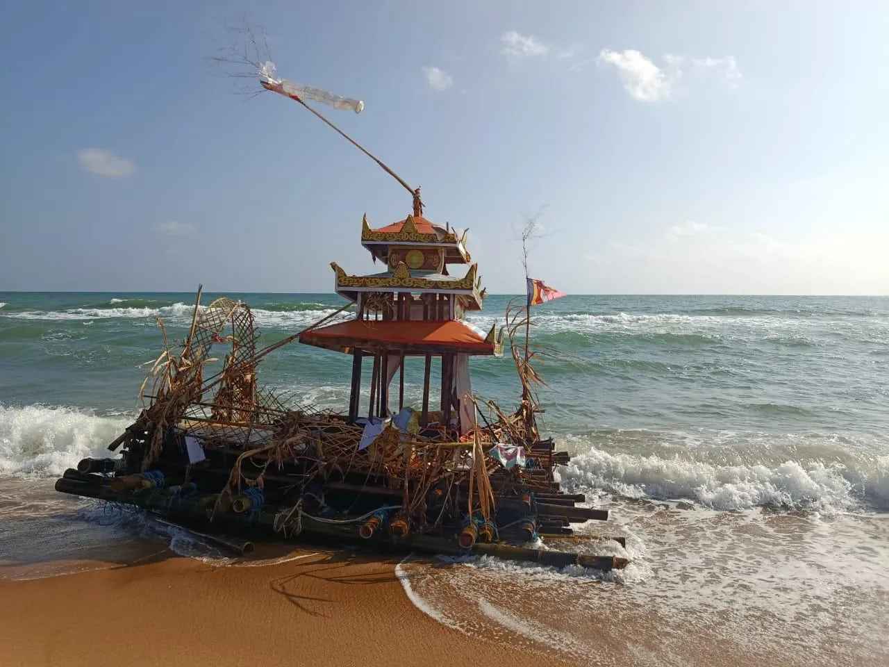 இது மியன்மார் நாட்டிலிருந்து வந்திருக்கலாம் என்று சந்தேகிக்கப்படுகின்றது. இத்தெப்பம் பௌத்த அடையாளங்களை கொண்டு காணப்படுகின்றது. பௌத்த பூஜை வழிபாடுகளின் பின் கடலில் விடப்பட்டிருக்கலாம் என்று சந்தேகிக்கப்படுகின்றது.