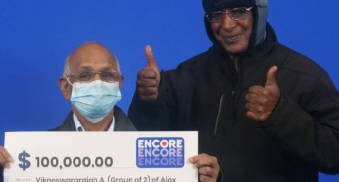 கனடாவில் நண்பர்களான இரண்டு ஈழத் தமிழர்களுக்கு லொட்டரியில் மிகப்பெரிய பரிசு விழுந்துள்ளது.கனடாவின் அஜாக்ஸ் (Ajax) நகரில் வசிக்கும் விக்கினேஸ்வரராஜா அமிர்தலிங்கம் (Vikneswararajah Amirthalingam) மற்றும் பரம்சோதி கதிர்காமு (Paramsothy Kathirgamu) ஆகிய இருவருக்குமே இந்த பரிசு விழுந்துள்ளது.