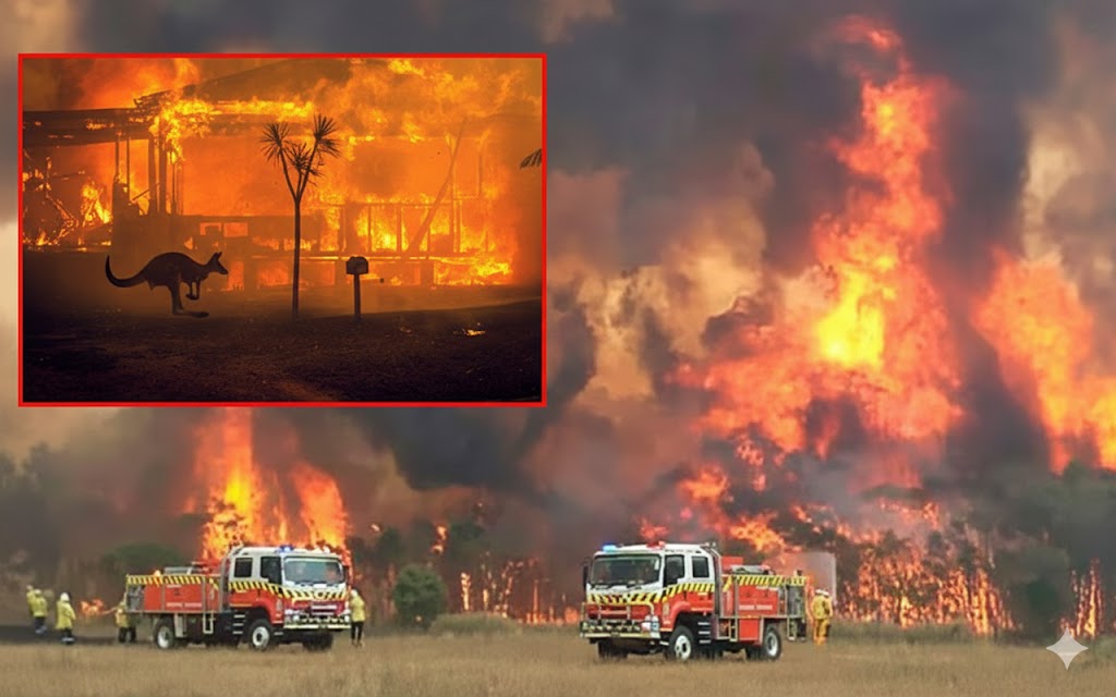 ஆஸ்திரேலியாவின் சில பகுதிகளில் வெப்பநிலை 50 டிகிரி செல்சியஸை எட்டியுள்ளதால், அங்குள்ள காடுகள் கொழுந்து விட்டு எரிகின்றன. விக்டோரியா மாகாணத்தில் மட்டும் 4 லட்சம் ஹெக்டேர் பரப்பளவிலான நிலங்கள் தீக்கிரையாகியுள்ளன. இதில் சுமார் 15,000 கால்நடைகள் உயிரிழந்துள்ளதாக தகவல்கள் தெரிவிக்கின்றன.
