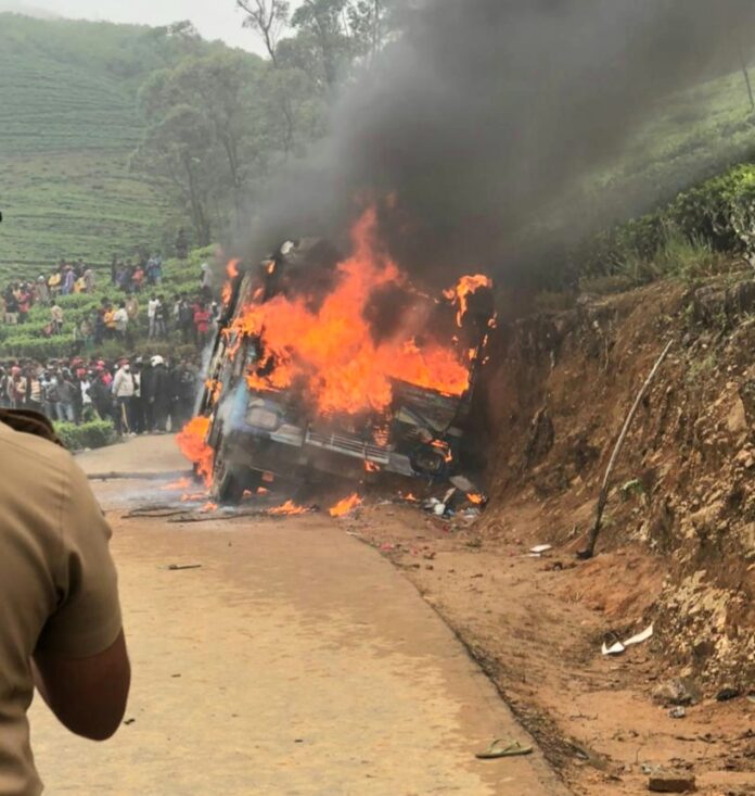 புஸல்லாவையில் பஸ் விபத்து – இருவர் பலி – பஸ்ஸை எரித்த மக்கள்