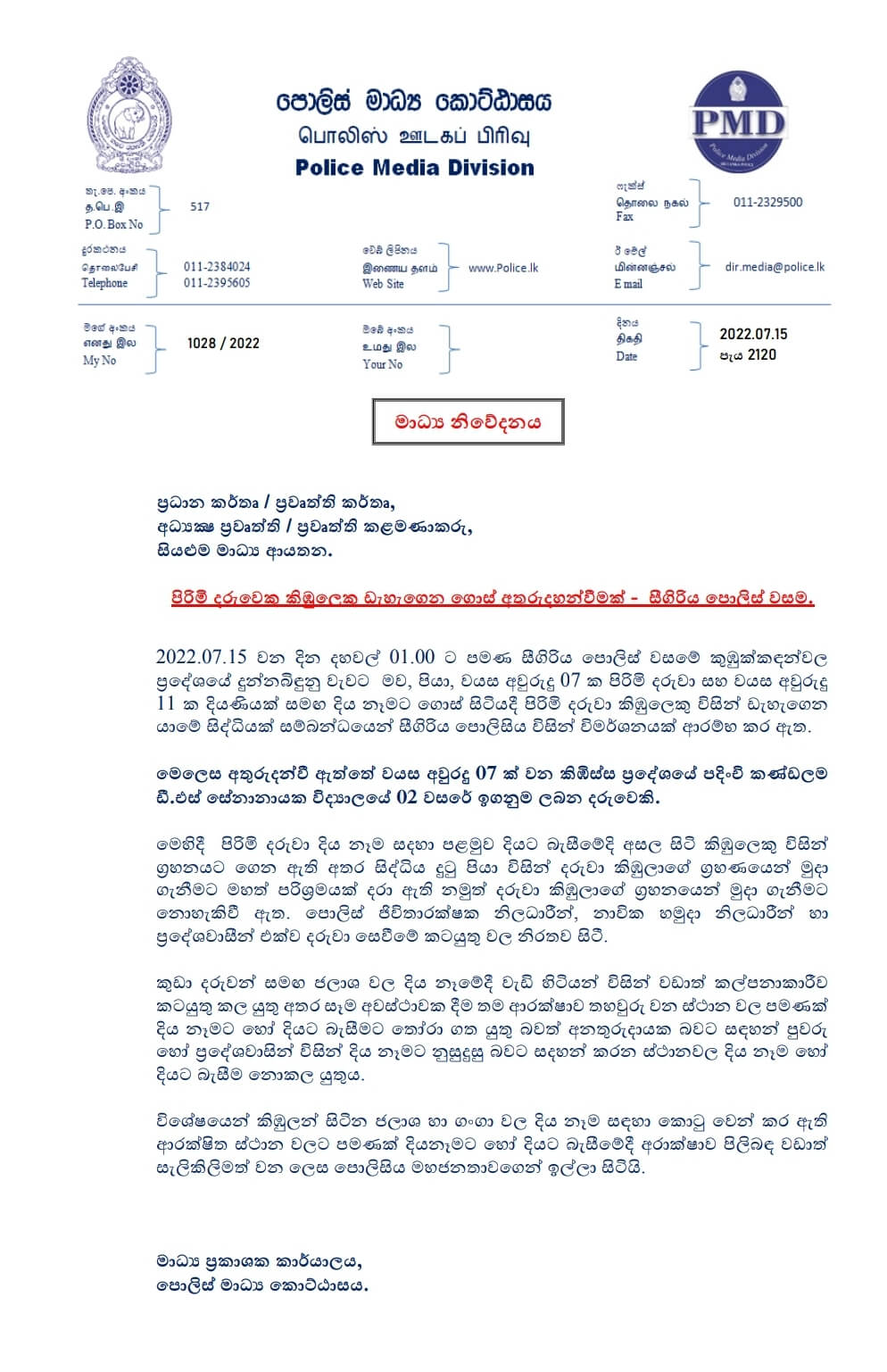 சிகிரியாவில் உள்ள நீர்நிலையொன்றில் குளித்துக்கொண்டிருந்த 7 வயதுடைய பாடசாலை மாணவன் ஒருவரே இவ்வாறு காணாமல்போயுள்ளார்.