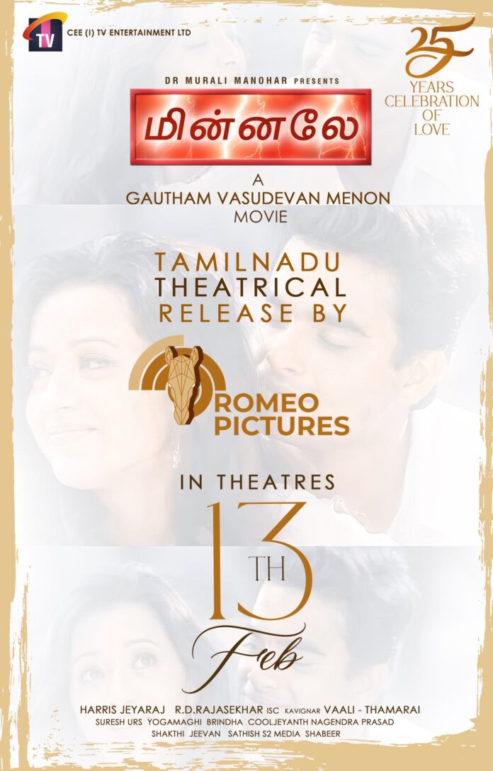 இந்நிலையில், நேற்றோடு ‘மின்னலே’ படம் வெளியாகி 25 வருடங்கள் நிறைவடைந்துள்ளது. இதைமுன்னிட்டு, ‘மின்னலே’ திரைப்படம் வரும் பிப்ரவரி 13ம் தேதி ரீ-ரிலீஸ் ஆகிறது.
